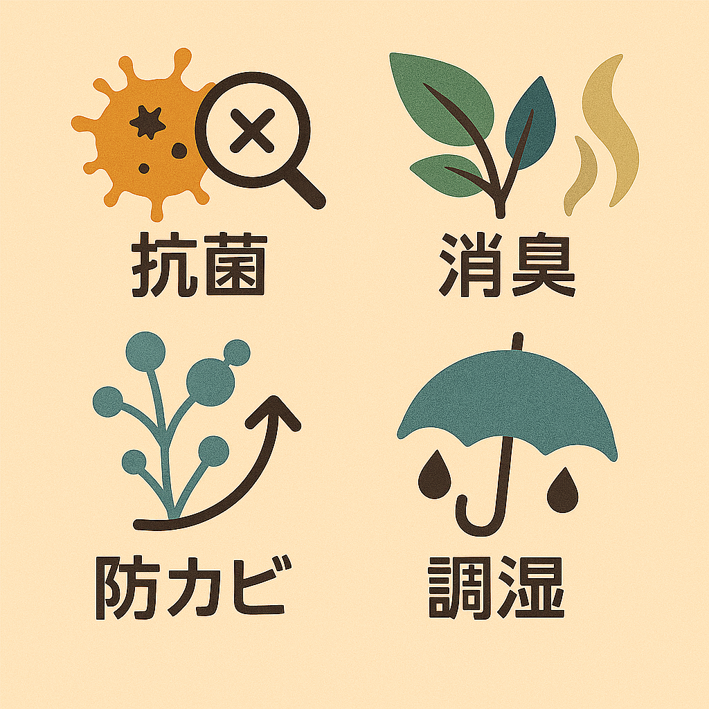 抗菌・消臭・防カビ・調湿など、暮らしを快適にするための機能が揃っています。